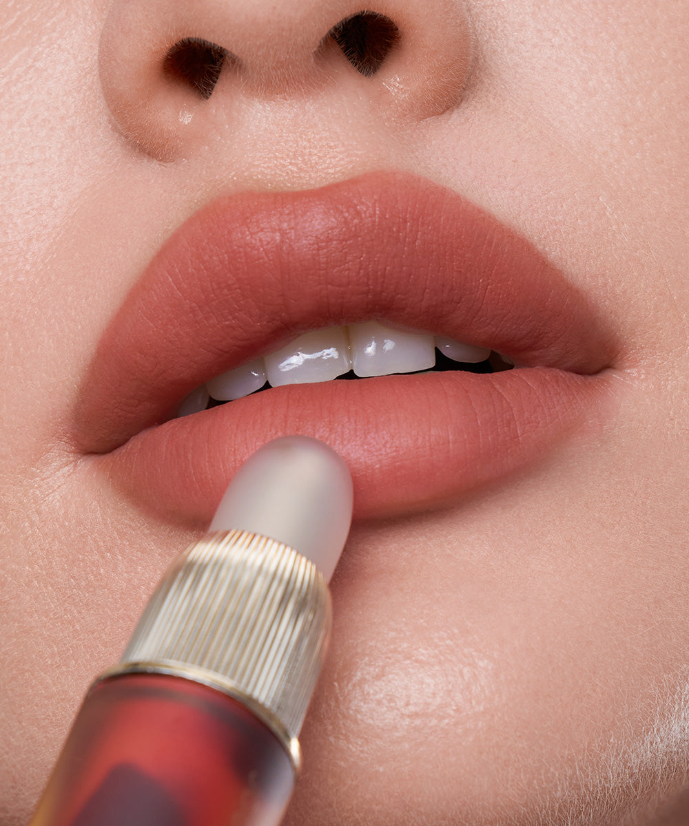 Dip the brush head into the product and apply a small amount to the center of the lips. Blend outwards towards the edges of the lips until they are evenly covered.